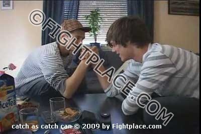 Already outside in the garden the two opponents, Basti and Shorty, are taunting eachother. They enter the house where Shorty wants to have a test of strength with Basti. They begin with arm wrestling and then check out their leg muscles. This smells like a match coming on! And so begins roughly 60 minutes of hard submission fighting, incorporating their favourite trick, the leg scissors, to eachothers' torment. The boys are of roughly equal strength and so these moves go back and forth until they are sweating hard, fighting on the ground. Also wedgies and ball-grabs are certainly not left out, it's simply "Catch as catch can"! Finally there is a beaten loser, who must pack up his things and go!
